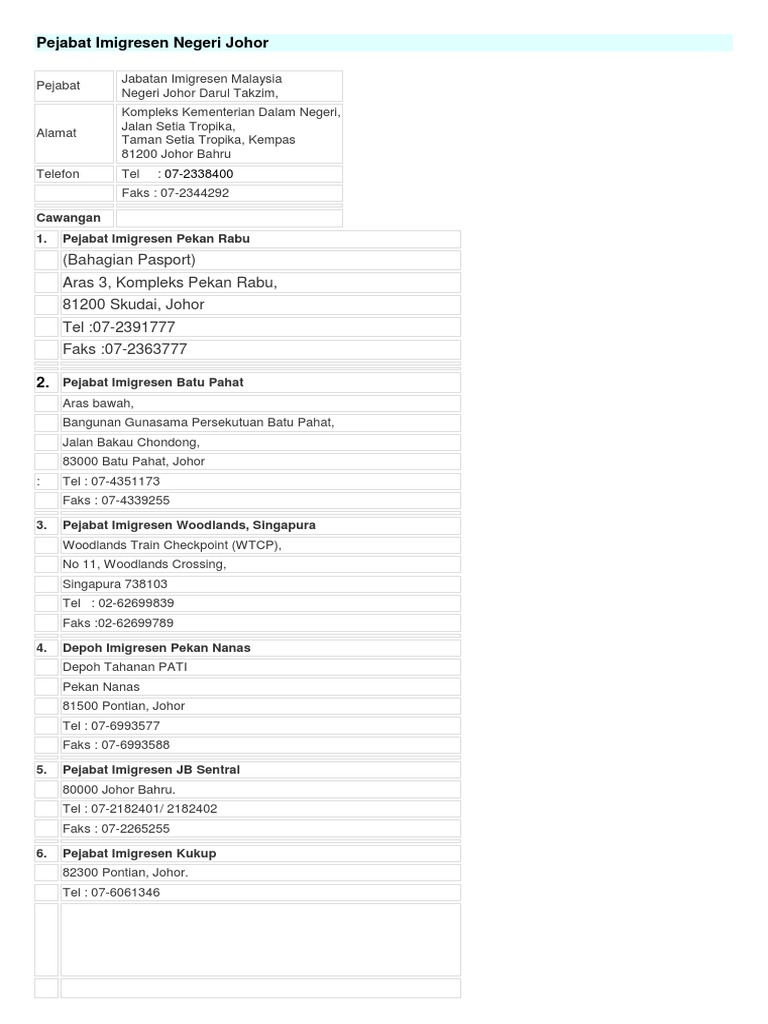 جابتن ايميڬريسين مليسيا) merupakan salah satu agensi di bawah kementerian dalam negeri. Apabila bangunan sultan ibrahim siap dibina pada tahun 1940, pejabat imigresen negeri johor beroperasi di tingkat bawah bangunan tersebut. Kompleks tan sri mohamed rahmat, no 1 jalan mata kuching, batu 5, jalan skudai, johor bahru, 81200, malaysia. 980,105 likes · 21,621 talking about this · 37 were here. Jabatan imigresen malaysia is a agensi kerajaan based in putrajaya, selangor.